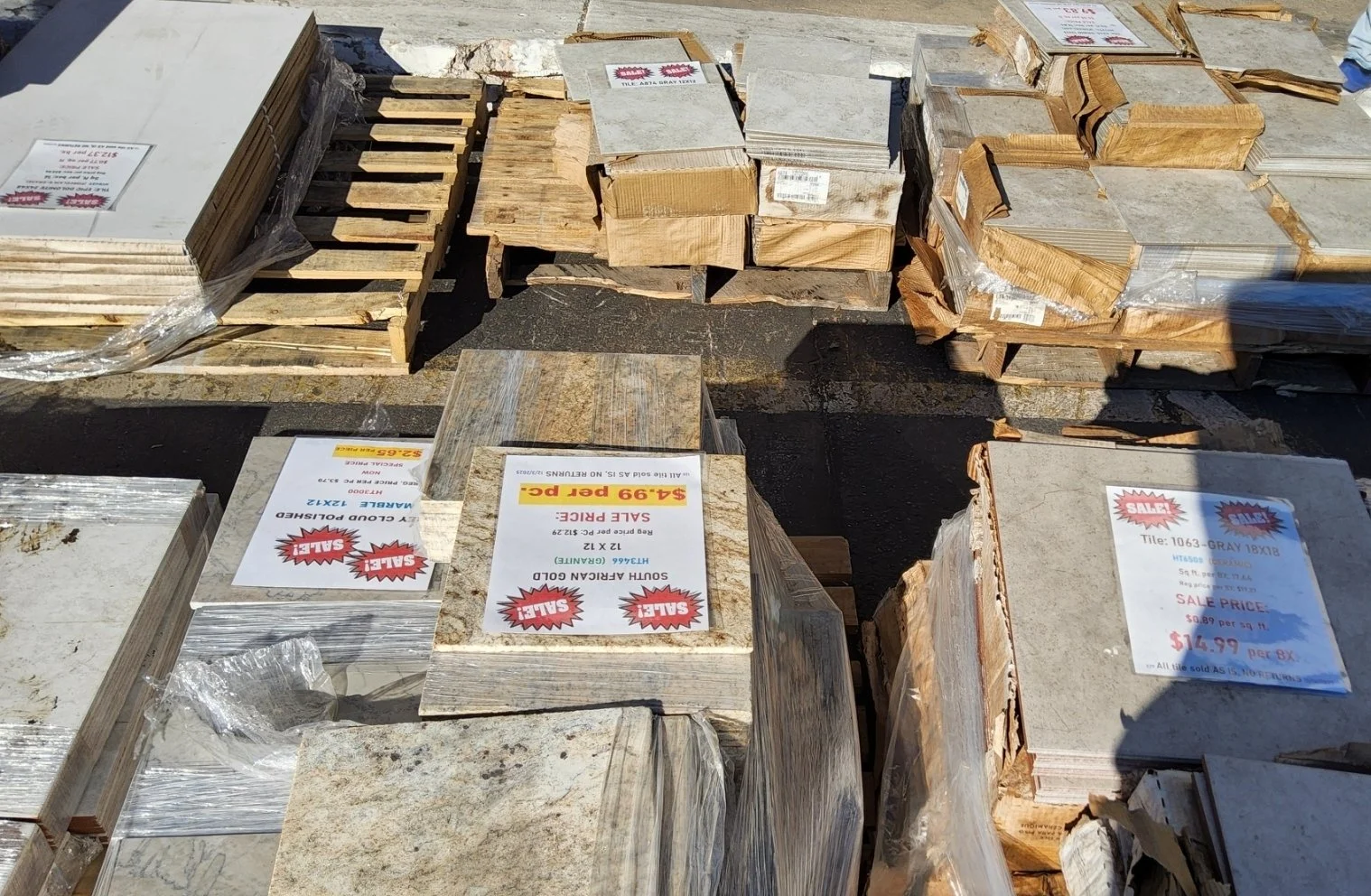 Assortment of Tiles For .65c sq ft May 28 Written By Samuel Arnold Tile MEASUREMENT PRICE SOUTH AFRICAN GOLD 12x12 $00.65 1063 GRAY 12x12 $00.65 GRIGIO 12x12 $00.65 Samuel Arnold